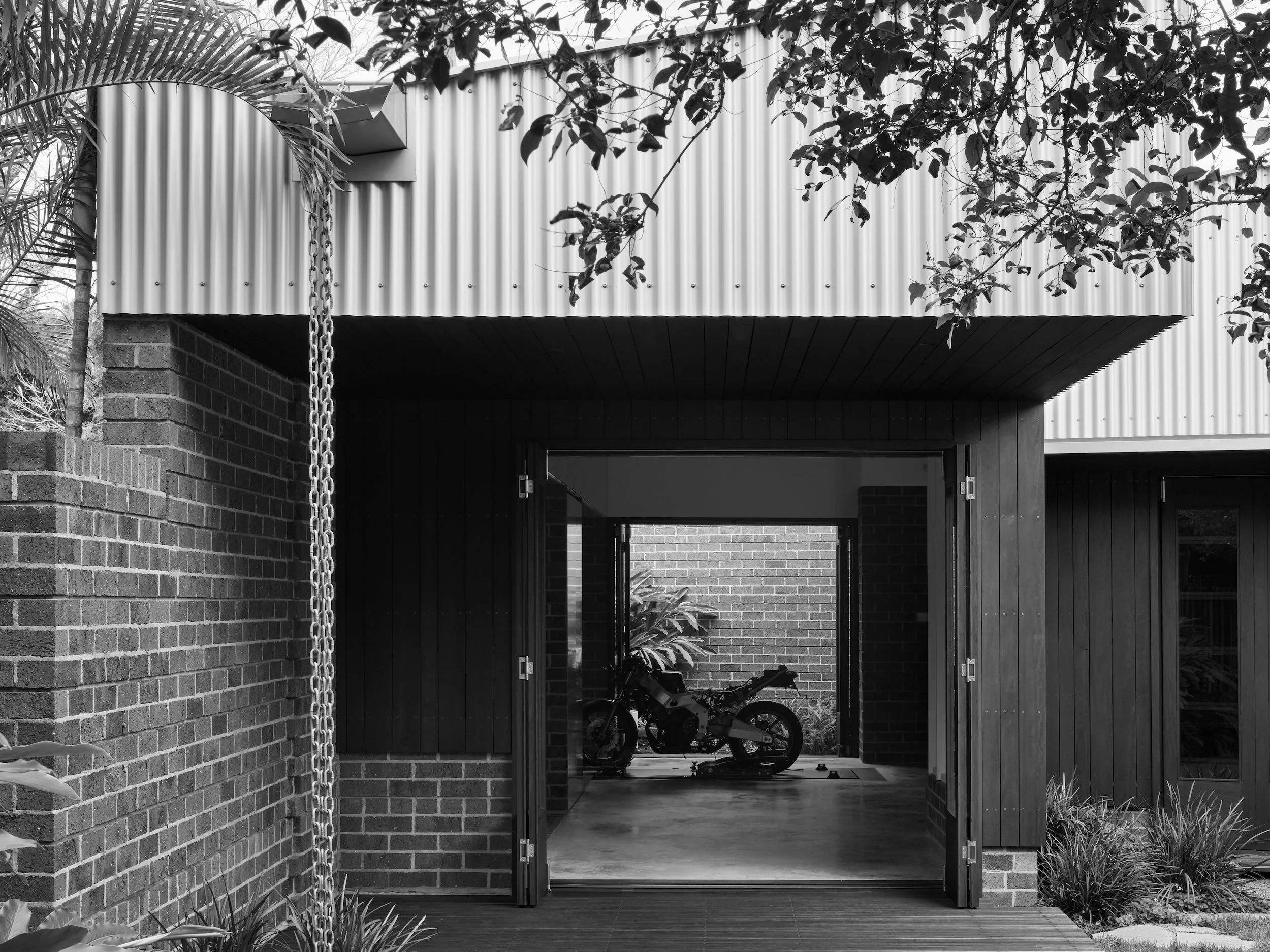 Set beside an archetypal post-war Queensland home, Motorradhaus responds sympathetically by reinterpreting the tripartite form – base, body, and roof. Resting on a concrete plinth, the brickwork base rises to match the floor level of the main residence. The body is wrapped in a ventilated timber screen which tucks elegantly beneath the deep profiled corrugated metal roof.